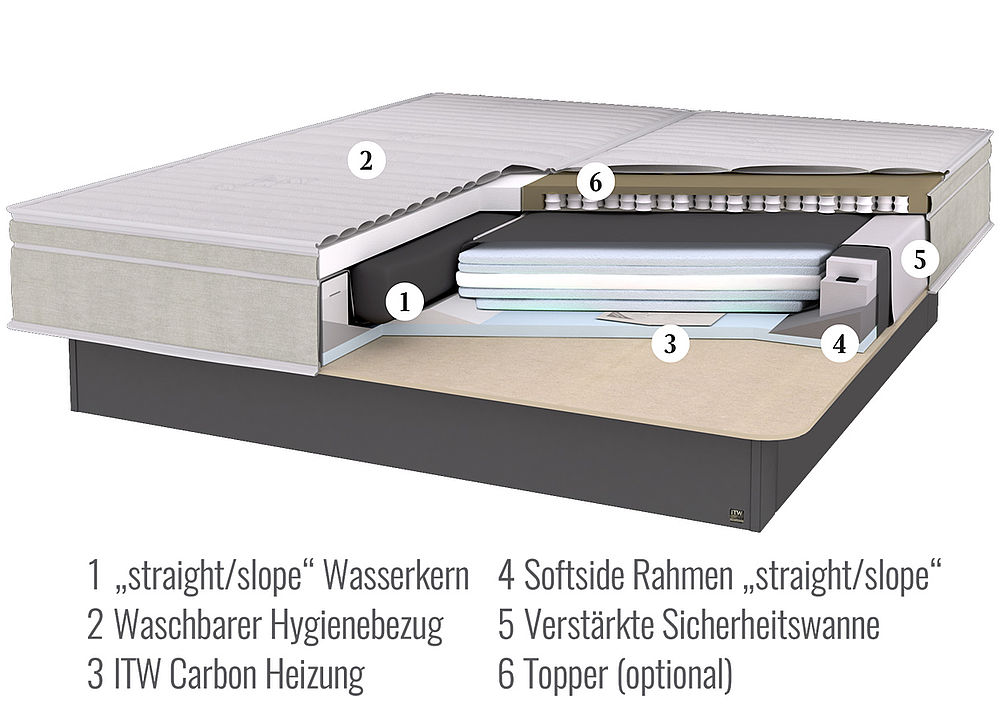 Der von ITW entwickelte „Straight/Slope“ Wasserkern wirkt den Scherkräften entgegen und erhöht so, in Verbindung mit dem perfekt passenden Rahmen, die Haltbarkeit. Fazit: Einfaches Einsteigen und optimaler Liegekomfort mit Langzeit-Garantie. Ein Dämpfungssystem verhindert die Wellenausbreitung durch hohe Dichte des Materials. Gitter erhöhen die Gleiteigenschaften zwischen den Vliesschichten. Vierlagige 3D-Schweißnähte – eine ITW-Innovation – garantieren die höchste Beanspruchbarkeit der Ecknähte.