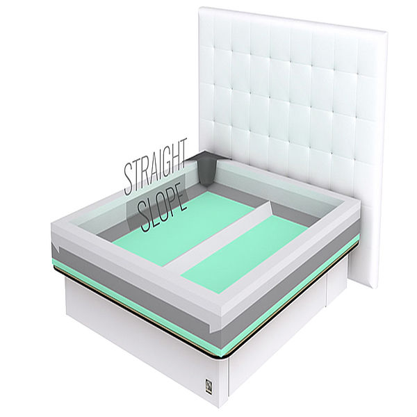 Das ITW Lectus hat als einziges Wasserbett einen Rahmen mit geraden („straight“) Seiten, der dir das gemütliche Hineinlegen und Aufstehen ermöglicht und noch dazu die Lebensdauer des Bettes verlängert. Eine keilförmige Weiterführung des Schaumstoffrahmens im Bodenbereich („slope“) garantiert die optimale Druckverteilung.